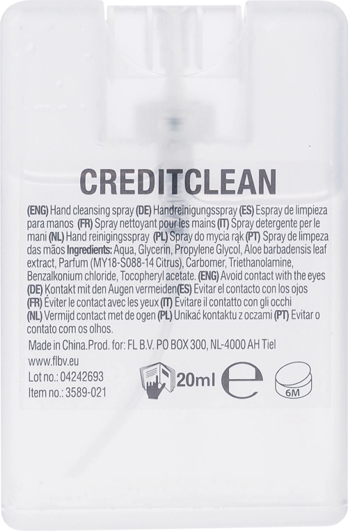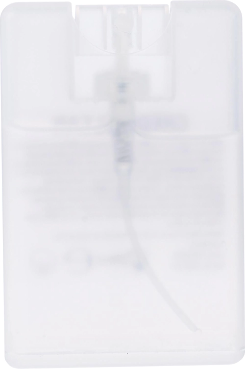 Hand spray in a transparent PET credit card shaped case (20ml).